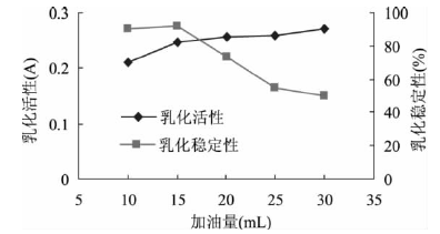 [9]等人在研究鷹嘴豆分離蛋白的乳化性時,設置不同梯度的含油量,分別為10、15、20、25、30mL,測定其乳化活性和乳化穩定性,結果如下: